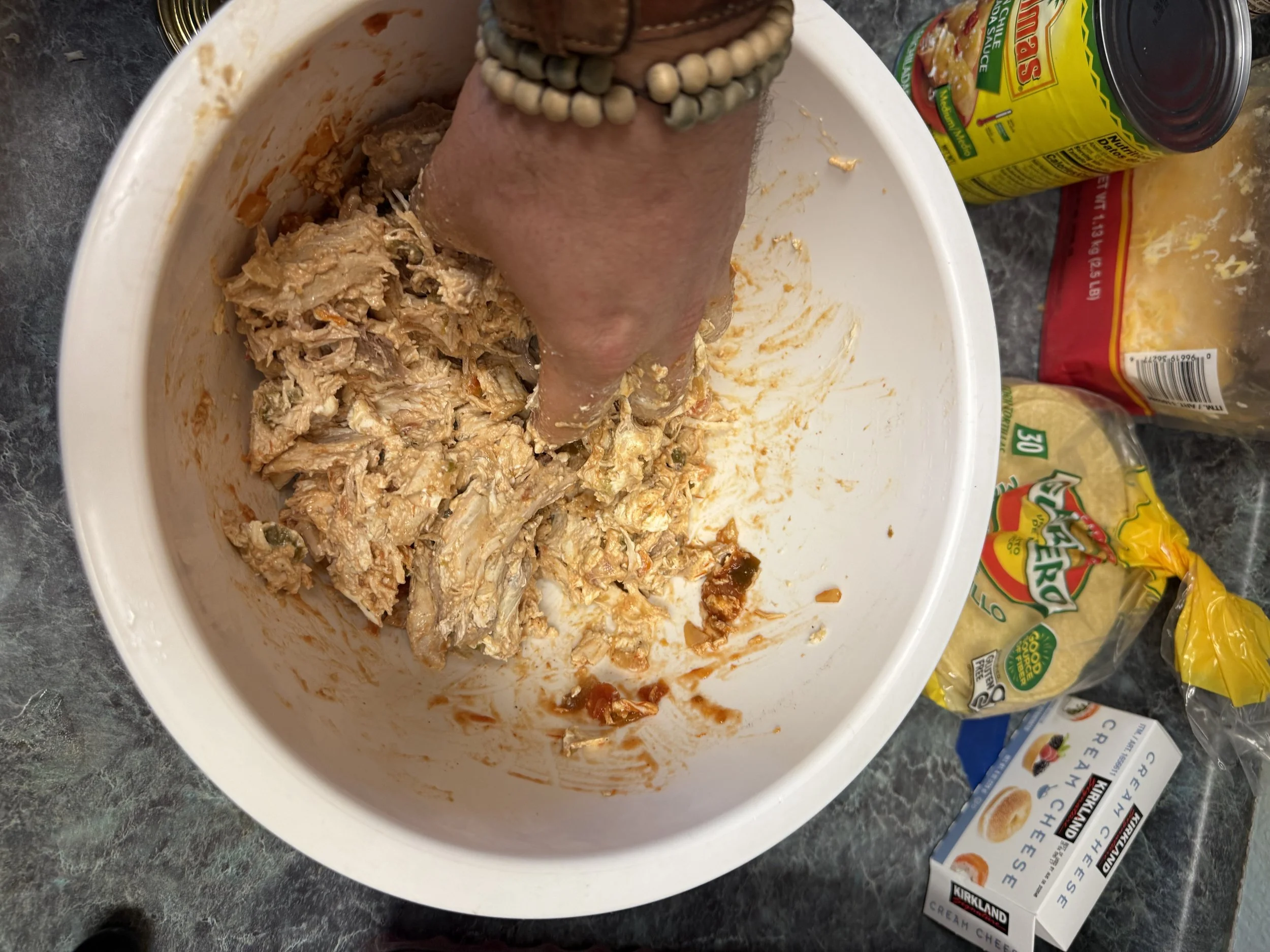 In a mixing bowl, combine shredded chicken, cream cheese, salsa, jalapeños, onion, garlic, cilantro, white cheddar, and seasoning. Mix by hand until fully combined.