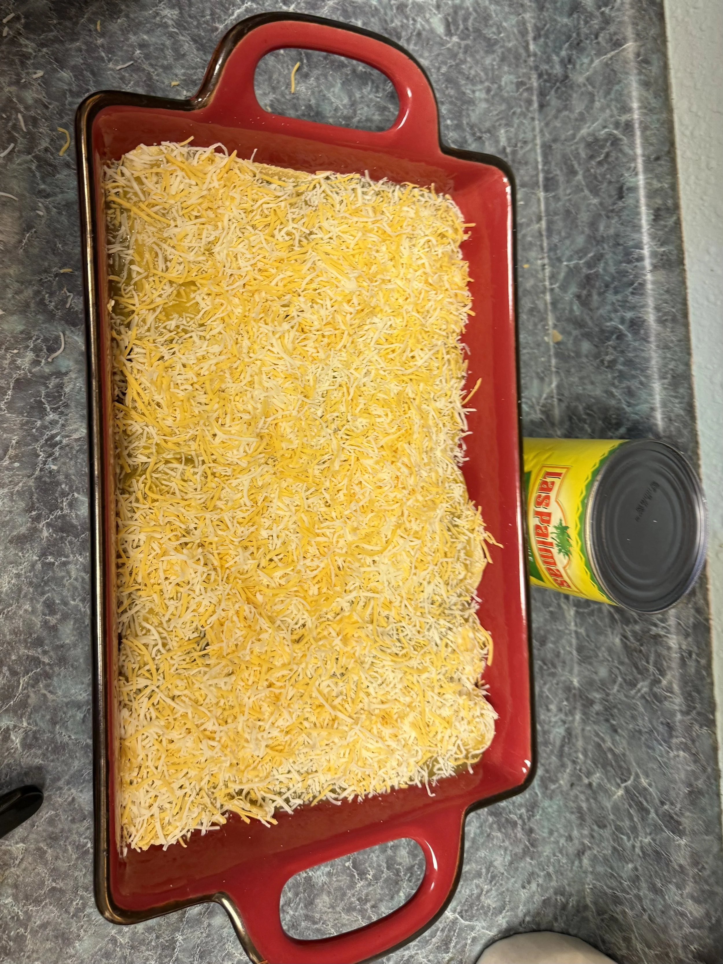 Finish with a layer of shredded cheddar or a Mexican blend, then cover with foil and slide the pan into a 375°F oven.