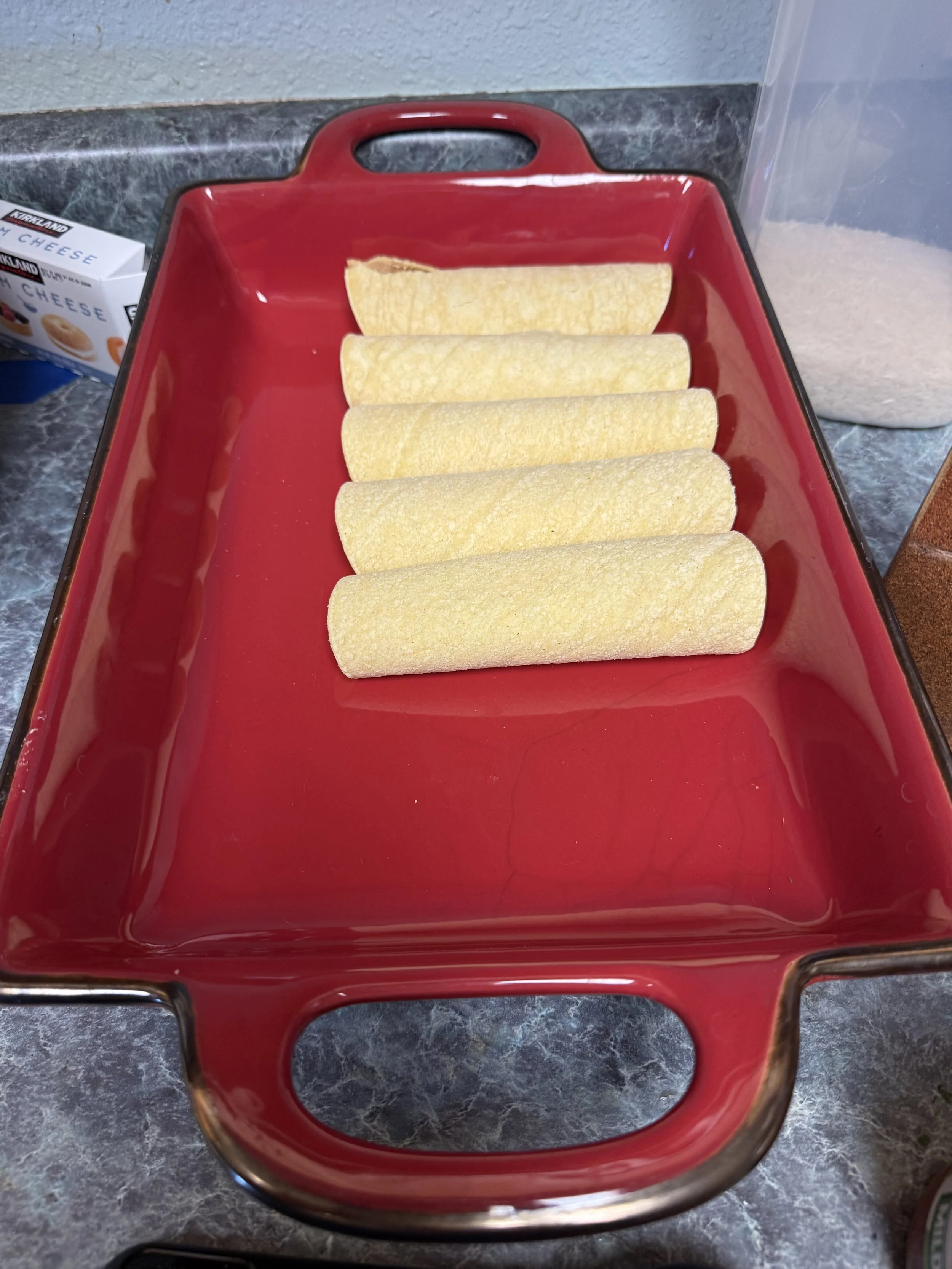 Laying the rolled tortillas in the pan.